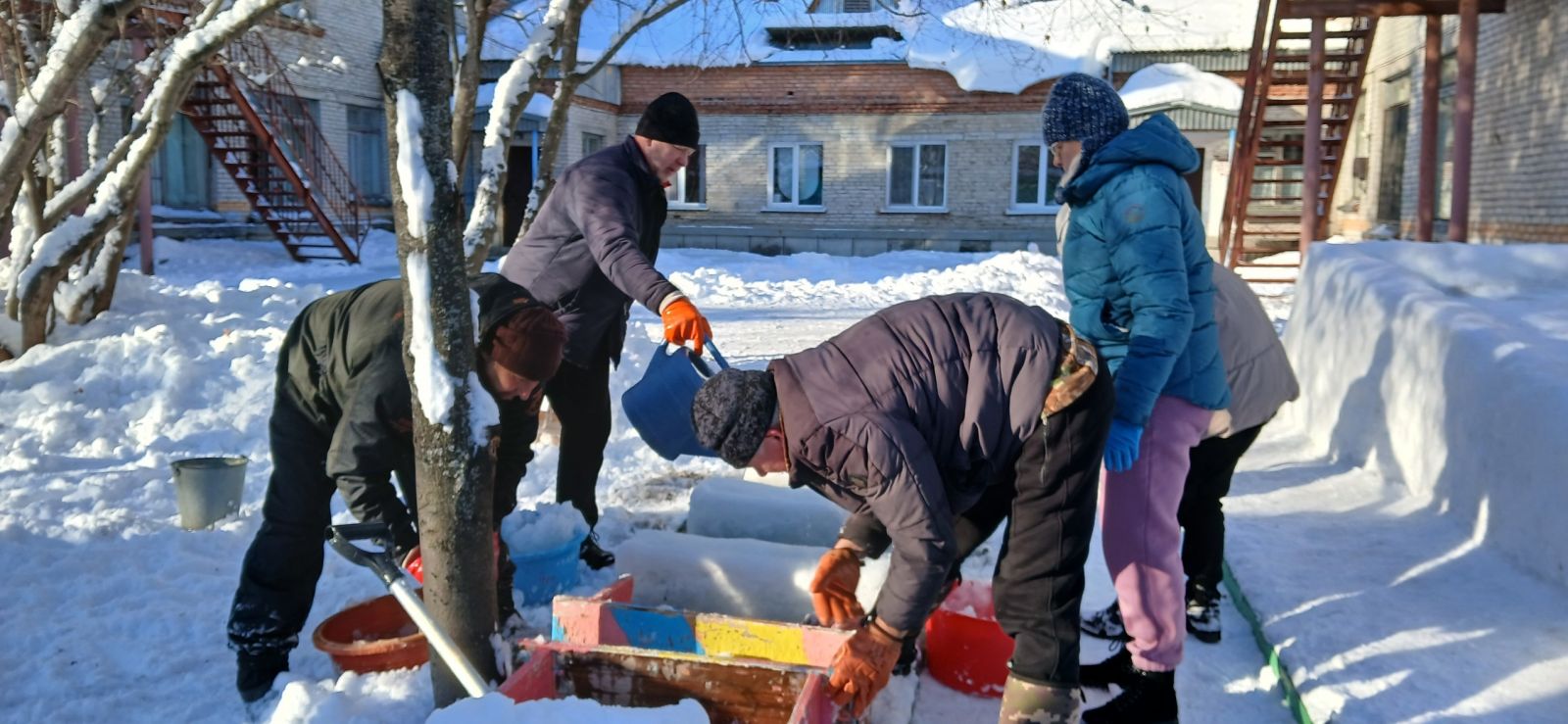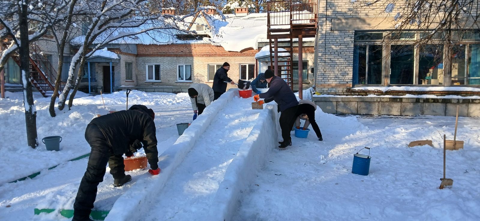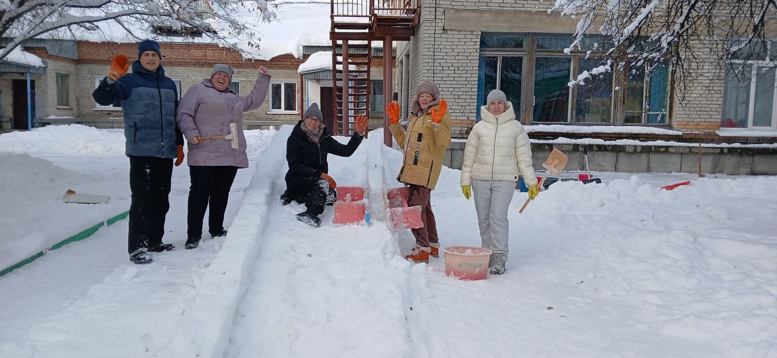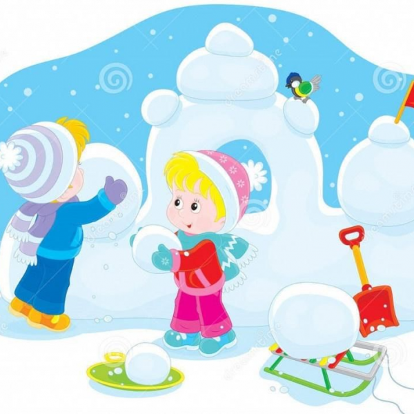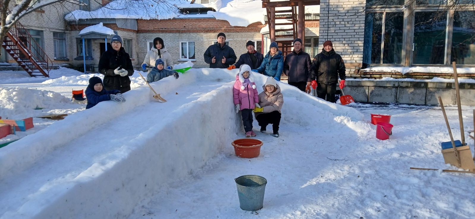 Дружно, весело, активно рассчищали участок от снега, носили воду, подносили снег для теста в тазик, облепляли, поливали и сделали отличную прочную горку, кирпичики для перешагивания, тунель для подлезания.