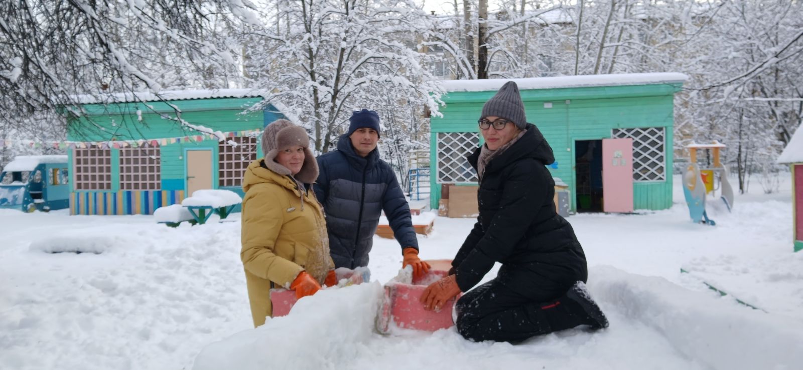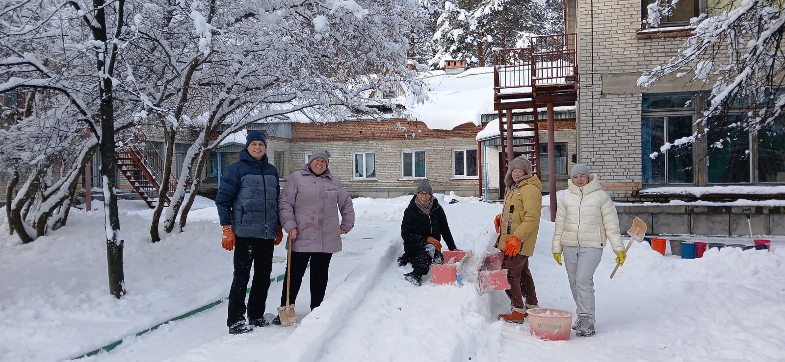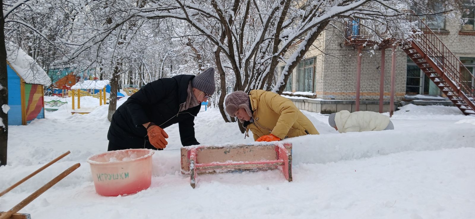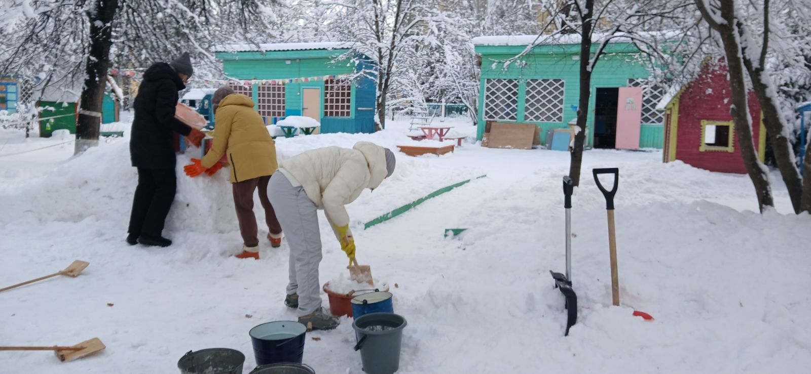 Дружно, весело, активно рассчищали участок от снега, носили воду, подносили снег для теста в тазик, облепляли, поливали и сделали отличную прочную горку, кирпичики для перешагивания, тунель для подлезания.