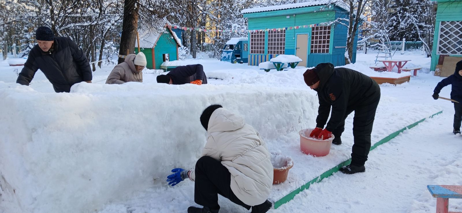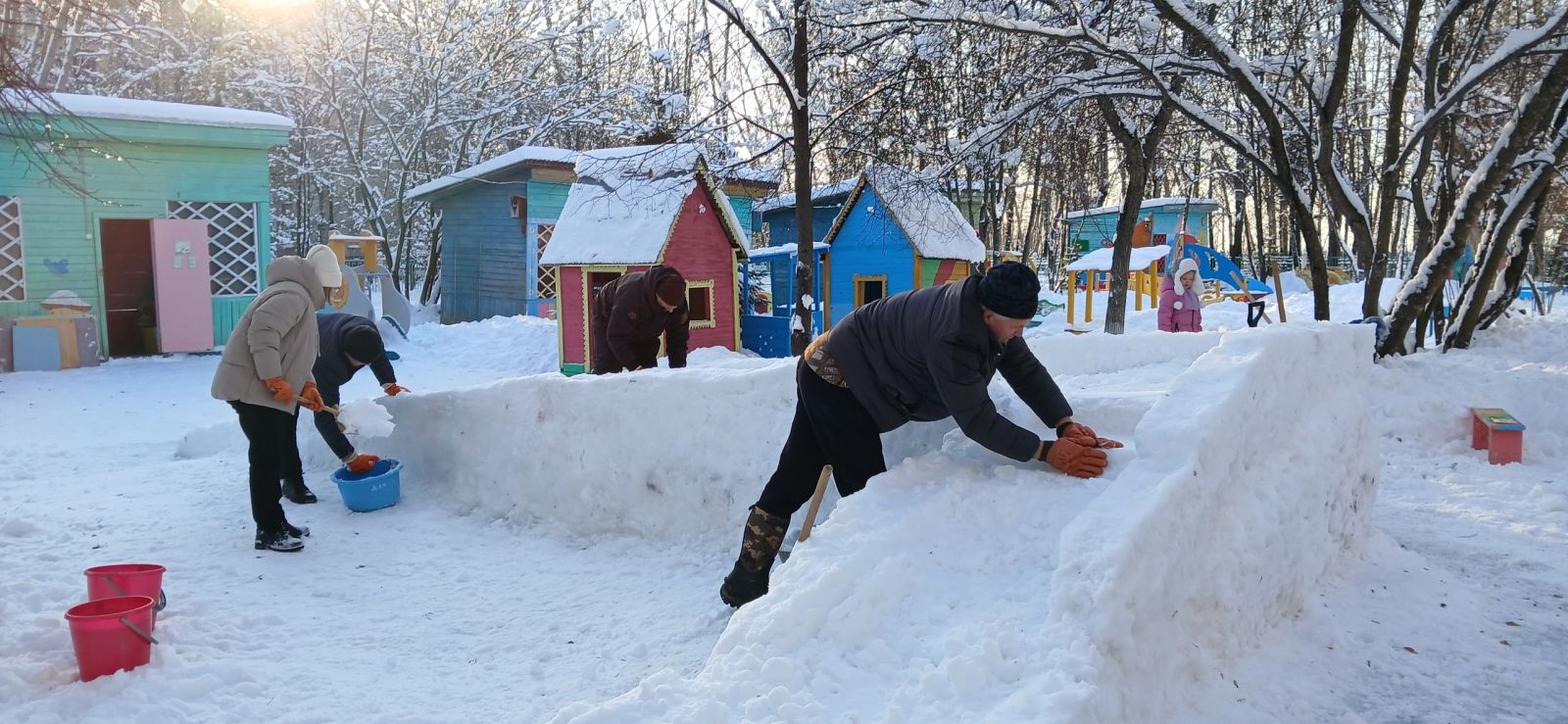 Прогулки в детском саду являются главным способом развития двигательной активности у детей. Чтобы сделать обычную прогулку радостным событием для дошколят в режиме дня, все вместе - родители, воспитатели и дети по традиции в выходные дни на площадке сделали снежные постройки.