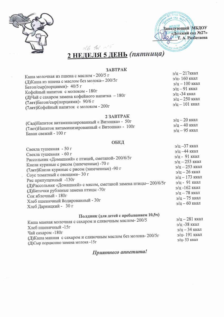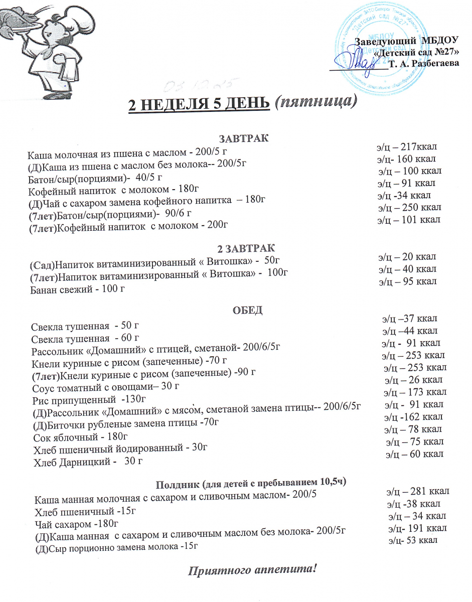Рацион питания разнообразен как за счет расширения ассортимента продуктов, так и за счет разнообразия блюд, готовящихся из одного продукта. В детском саду имеется картотека технологических карт, утвержденная заведующим МБДОУ «Детский сад №27».