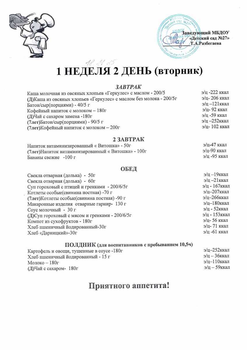 Питание в МБДОУ «Детский сад № 27» осуществляется в соответствии с 20-дневным меню для детей с 10,5 и 12 часовым пребыванием в дошкольном образовательном учреждении, разработанным на основе физиологических потребностей в пищевых веществах и норм питания дошкольников в соответствии с «Санитарно –эпидемиологических требований к организации общественного питания населения». Меню включает горячее питание, а также индивидуальное меню для детей, нуждающихся диетическом питании. Родителям (законным представителям) воспитанников необходимо предоставить в МБДОУ документы, подтверждающие необходимость создания для ребенка специализированного меню (диетического) или организации индивидуального подхода в питании.